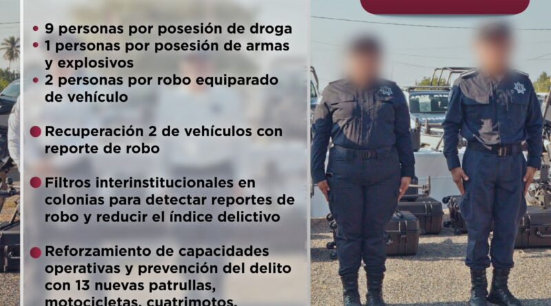 La Dirección de Seguridad Pública de Manzanillo informa que, durante los patrullajes permanentes realizados en el municipio, se logró la detención de nueve personas por posesión de sustancias ilícitas, dos por robo equiparado de vehículo y una más por portación de armas de fuego con cartuchos útiles.