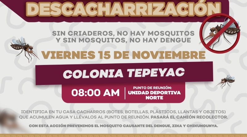 El Gobierno Municipal de Tecomán, en conjunto con la Jurisdicción Sanitaria No. 2 y el Sector Salud, invitan a la población de la colonia Tepeyac a sumarse a la campaña de descacharrización, que se llevará a cabo este viernes 15 de noviembre a las 8 de la mañana.