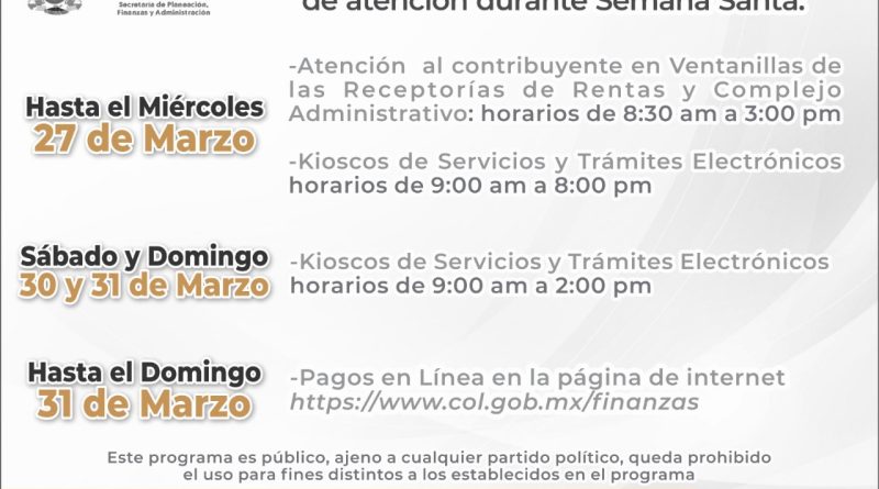 Se informa que los días 28 y 29 de marzo de 2024 (jueves y viernes de Semana Santa), las oficinas y módulos de Asistencia al Contribuyente permanecerán cerrados. Para mayor información, llamar al 312-316-2000 extensión 21327 y 21304 en la Dirección General de Ingresos.