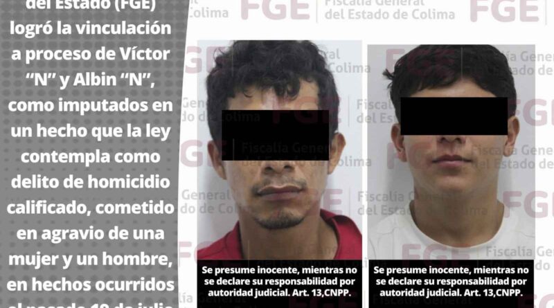 La Fiscalía General del Estado (FGE) logró la vinculación a proceso de Víctor “N” y Albin “N”, como imputados en un hecho que la ley contempla como delito de homicidio calificado, cometido en agravio de una mujer y un hombre, en hechos ocurridos el pasado 19 de julio en el ejido Tapeixtles, municipio de Manzanillo.