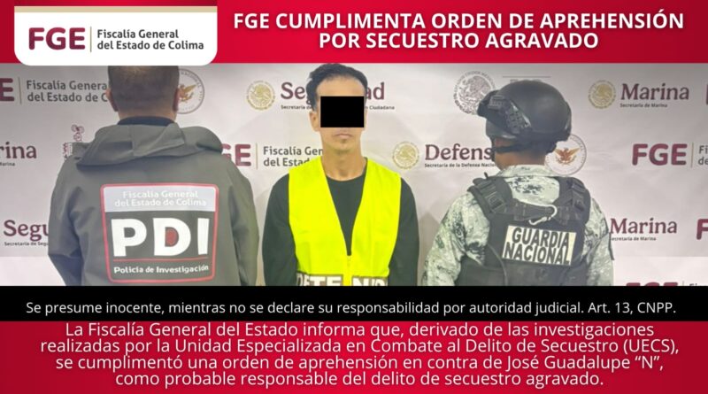 La Fiscalía General del Estado informa que, como resultado de las investigaciones realizadas por la Unidad Especializada en Combate al Delito de Secuestro (UECS), se cumplimentó una orden de aprehensión en contra de José Guadalupe “N”, como probable responsable del delito de secuestro agravado.